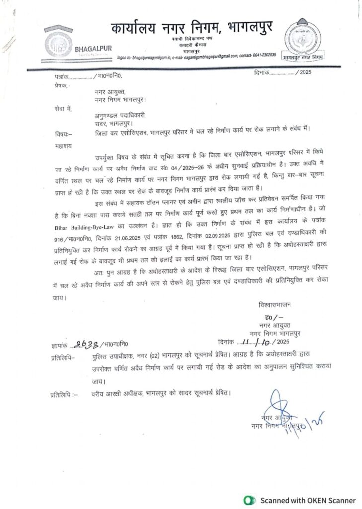 भागलपुर: कानून की धज्जियां उड़ाते DBA महासचिव के सामने एसडीओ खामोश! नगर आयुक्त लेटर भेजने में हीरो और एक्शन में जीरो, जिला बार एसोसिएशन परिसर में अवैध निर्माण निरंतर जारी