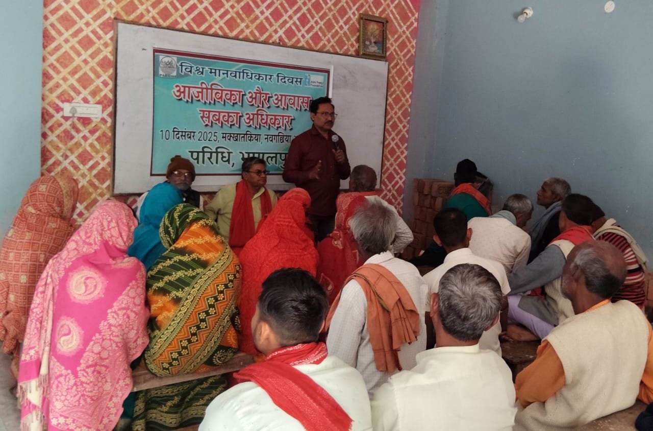 परिधि संस्था द्वारा आज अंतरराष्ट्रीय मानवाधिकार दिवस पर भागलपुर जिले के दो स्थानों—मक्खातकिया (नवगछिया) और कागजीटोला (कहलगाँव)—में कार्यक्रम आयोजित किए गए। मक्खातकिया में कार्यक्रम की अध्यक्षता छत्तीस सिंह ने की, जहाँ “आजीविका और आवास अधिकार – मानवधिकार” विषय पर संवाद हुआ। वहीं कहलगांव में आयोजित कार्यक्रम की अध्यक्षता राजू सहनी तथा संचालन योगेंद्र सहनी ने किया।