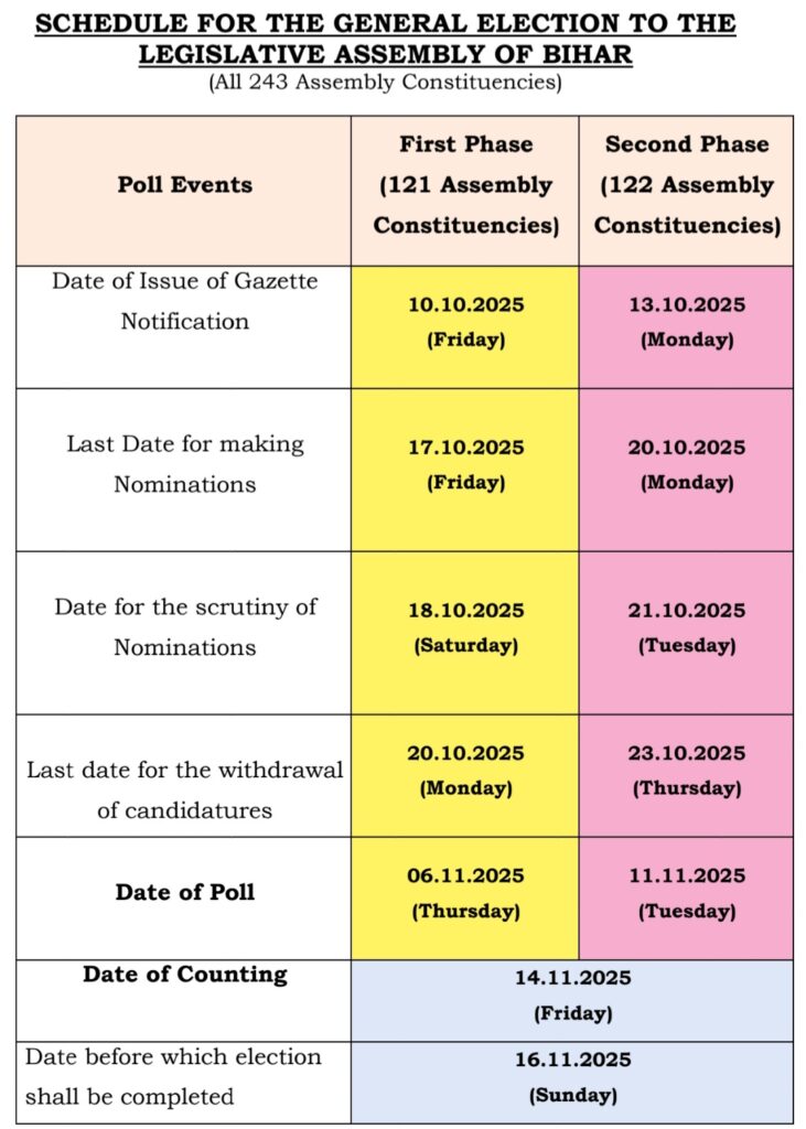 चुनाव कार्यक्रम के अनुसार, प्रथम चरण में 121 सीटों और द्वितीय चरण में 122 सीटों पर मतदान होगा। पहले चरण का मतदान 6 नवंबर और दूसरे चरण का 11 नवंबर को मतदान होगा। जबकि मतगणना दोनों चरणों के मतदान के बाद एक साथ 14 नवंबर को की जाएगी। बता दें कि भागलपुर जिले के सभी सात विधानसभा में दूसरे चरण में 11 नवंबर को वोटिंग होगी।