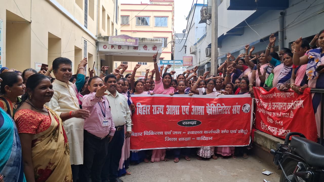मंगलवार को दोपहर सदर अस्पताल कटिहार के प्रांगण में बिहार चिकित्सा एवं जन स्वास्थ्य कर्मचारी संघ के बैनर तले सैकड़ो की संख्या में मौजूद आशा कार्यकर्ता एवं स्वास्थ्य कर्मियों ने अपने लंबित मांगों के समर्थन में सरकार के विरुद्ध जमकर नारेबाजी की। नारेबाजी मे शामिल आशा कार्यकर्ताओ ने कहा कि हम लोगों को 24 घंटे काम करना पड़ता है । जिसके एवज में एक दैनिक मजदूर की मजदूरी से भी कम रुपए हम लोगों को मिलता है। जो कहीं से भी न्याय संगत नहीं है, हम लोगों को सरकार राज्य कर्मी का दर्जा दे और कम से कम 26000 रुपए प्रति माह मानदेय दे ।