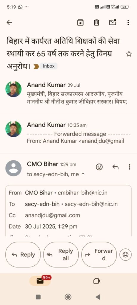 इस संदर्भ में डॉ. आनंद कुमार, अतिथि शिक्षक (व्याख्याता) एवं प्रदेश प्रवक्ता, जद(यू) शिक्षा प्रकोष्ठ, बिहार, ने एक ईमेल पत्र के माध्यम से मुख्यमंत्री से अपनी मांगों को स्पष्ट रूप से रखा है।