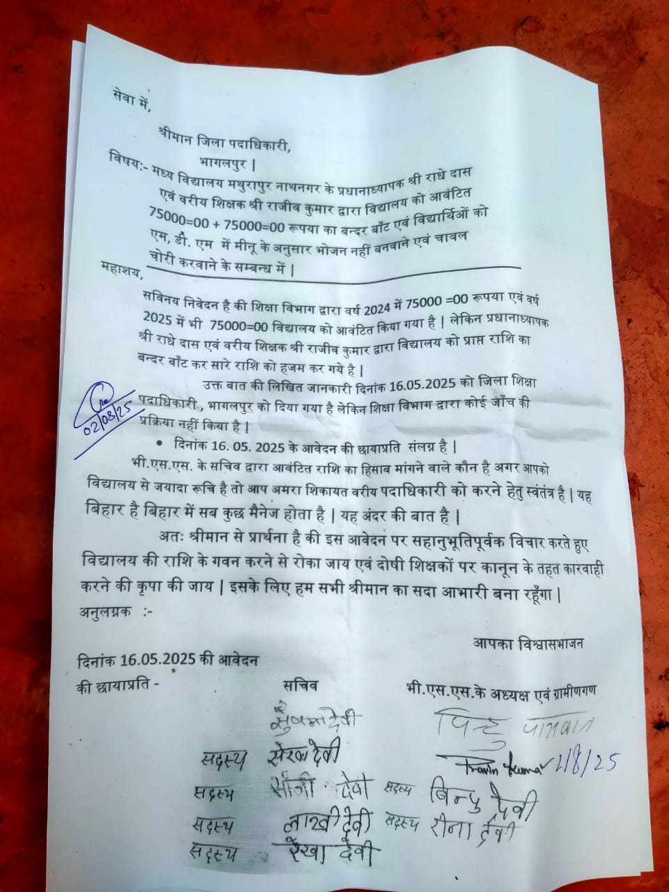 ग्रामीणों और विद्यालय शिक्षा समिति के अध्यक्ष ने जिला शिक्षा पदाधिकारी और जिलाधिकारी को लिखित शिकायत देकर बताया है कि वर्ष 2024 और 2025 में स्कूल को क्रमशः 75-75 हजार की राशि मिली थी, लेकिन धरातल पर कोई विकास कार्य नहीं हुआ। पूरा पैसा कथित रूप से आपसी मिलीभगत से हड़प लिया गया।