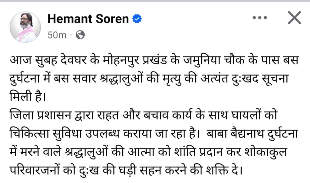 मुख्यमंत्री हेमंत सोरेन का शोक संदेश
