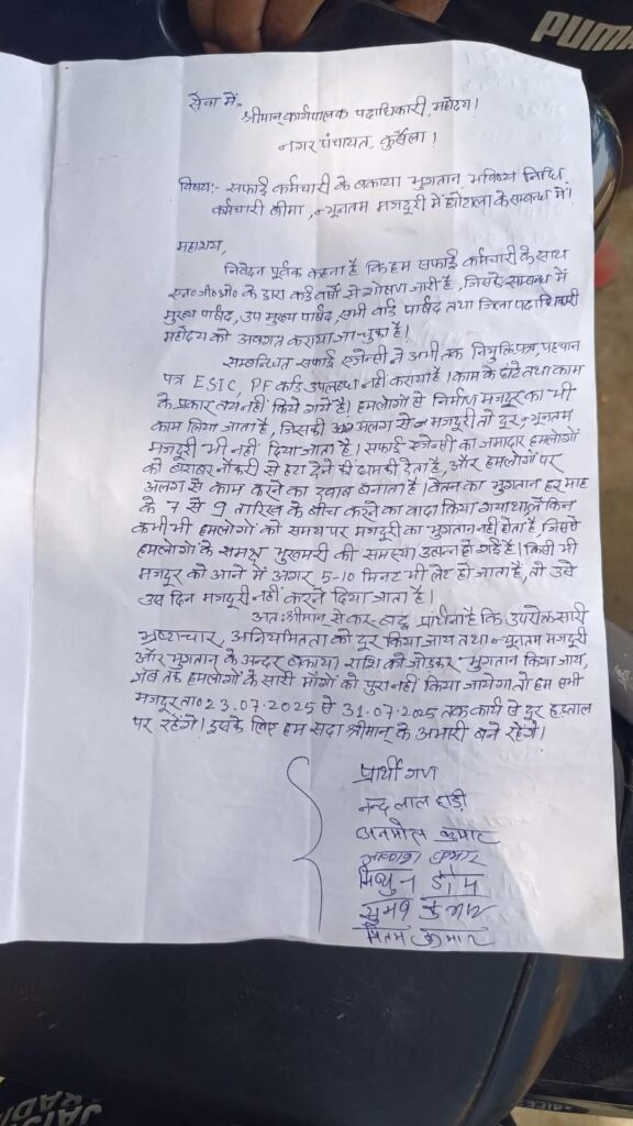 जिले के कुर्सेला नगर पंचायत के सफाई कर्मी बकाया भुगतान नहीं होने कारण हड़ताल पर चले गए हैं। सफाई कर्मियों के हड़ताल से नगर पंचायत क्षेत्र में जगह-जगह कचरे का ढेर लग गया है। बता दें कि बकाया भुगतान की मांग को लेकर सभी कर्मचारियों ने हड़ताल कर विरोध जताया। हड़ताली सफाई कमिर्यों ने अपने आवेदन में बताया है कि सफाई कर्मचारी के बकाया भुगतान, भविष्य निधि कर्मचारी बीमा, न्यूनतम मजदूरी में घोटाला के साथ ही एन जी ओ के द्वारा कई वर्षों से शोषण जारी है, जिसके सम्बन्ध में मुख्य पार्षद, उप मुख्य पार्षद, सभी वार्ड पार्षद तथा जिला पदाधिकारी महोदय को अवगत कराया जा चुका है।