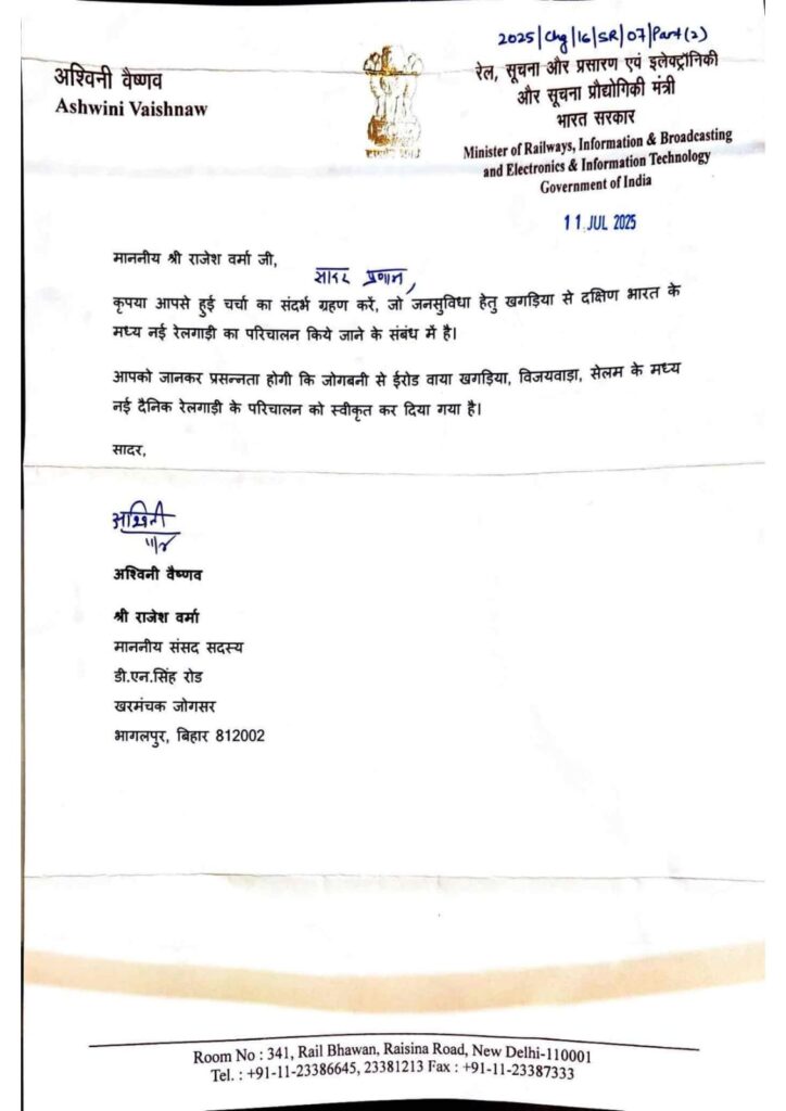 गौरतलब है कि सांसद राजेश वर्मा ने बीते दिनों रेल मंत्री से मिलकर अनरोध पत्र सौंपा था। जिसमें उनके द्वारा बताया गया था कि खगड़िया से दक्षिण भारत के लिए कोई सीधी ट्रेन नहीं है। इसके कारण लोगों को घोर कठिनाइयों का सामना करना पड़ता है। जिसके बाद रेल मंत्री के द्वारा उनको आश्वासन मिला था कि जल्द इस समस्या से खगड़िया के लोग निजात पाएंगे।