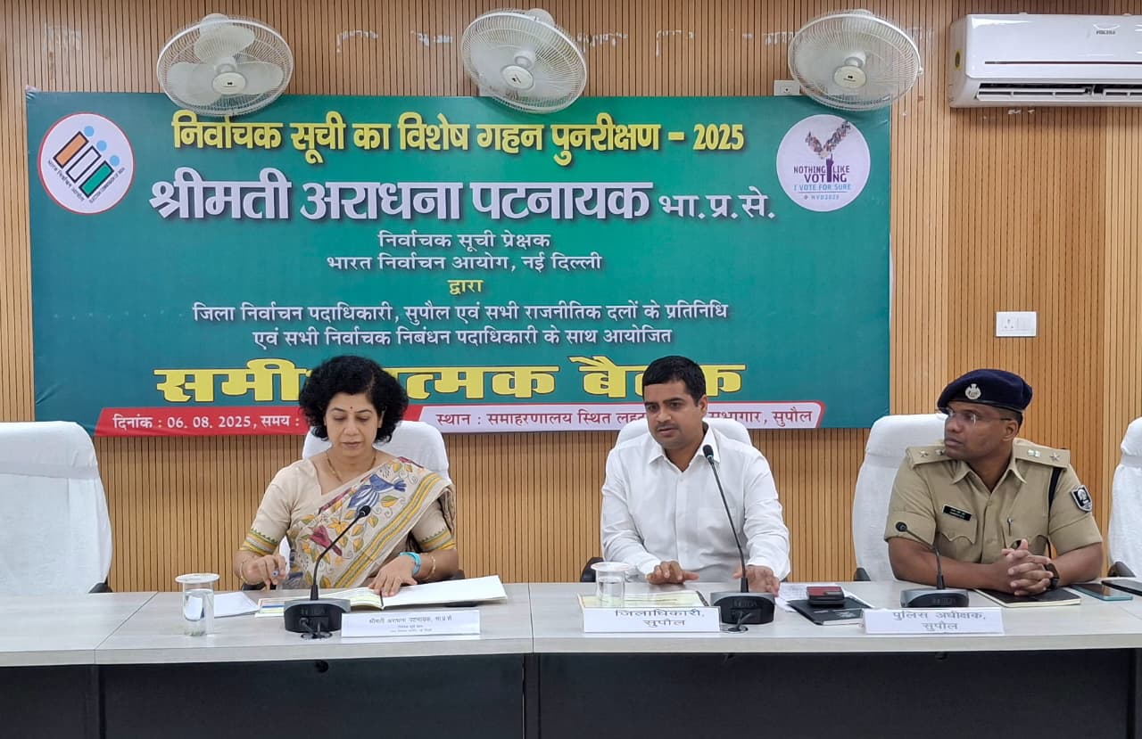 भारत निर्वाचन आयोग, नई दिल्ली द्वारा नियुक्त निर्वाचक सूची अराधना पटनायक ने बुधवार को सुपौल समाहरणालय स्थित लहटन चौधरी सभागार में मान्यता प्राप्त राष्ट्रीय एवं राज्य स्तरीय राजनीतिक दलों के जिला अध्यक्षों और सचिवों के साथ बैठक की।