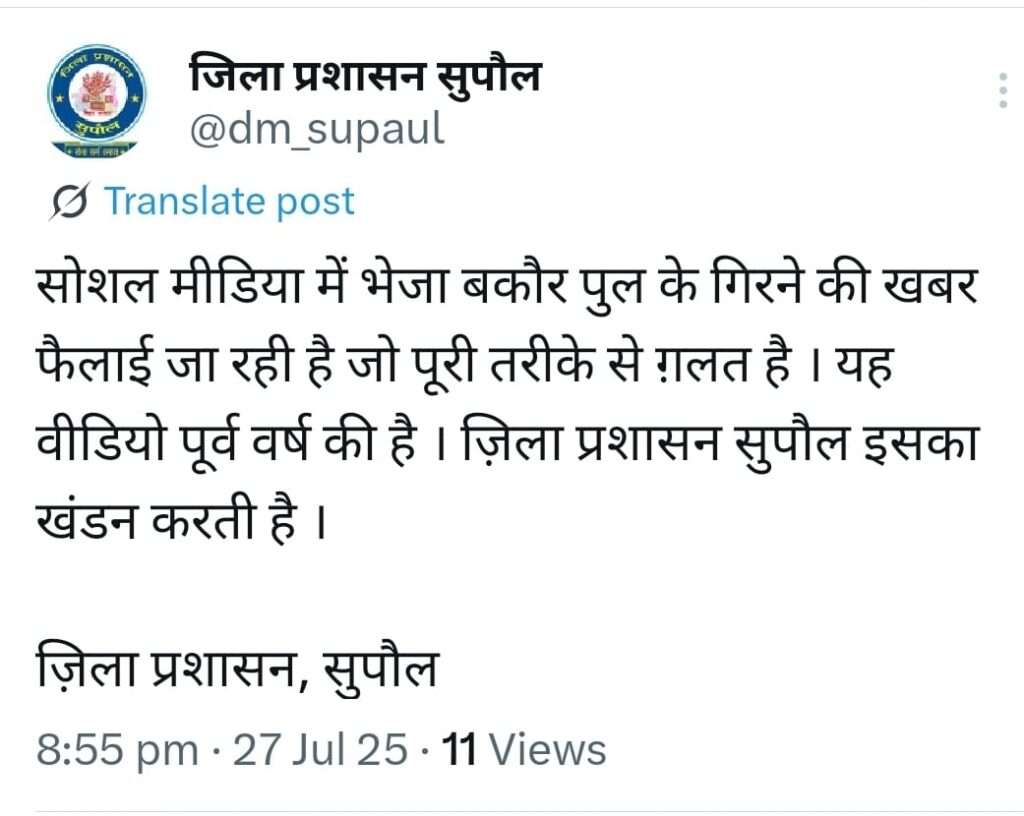 वायरल वीडियो सालभर पुराना है। एनएचएआई के अभियंता राहुल कुमार ने बताया कि एक वर्ष पूर्व का वीडियो है, जिसे गलत तरीके से वायरल किया जा रहा है। जिला प्रशासन ने भी इसका खंडन किया है। वहीं, डीएम के ओएसडी विकास कुमार कर्ण ने कहा कि सोशल मीडिया में भेजा बकौर पुल के गिरने की खबर फैलाई जा रही है, जो पूरी तरीके से ग़लत है । यह वीडियो पूर्व वर्ष की है । ज़िला प्रशासन सुपौल इसका खंडन करता है ।
