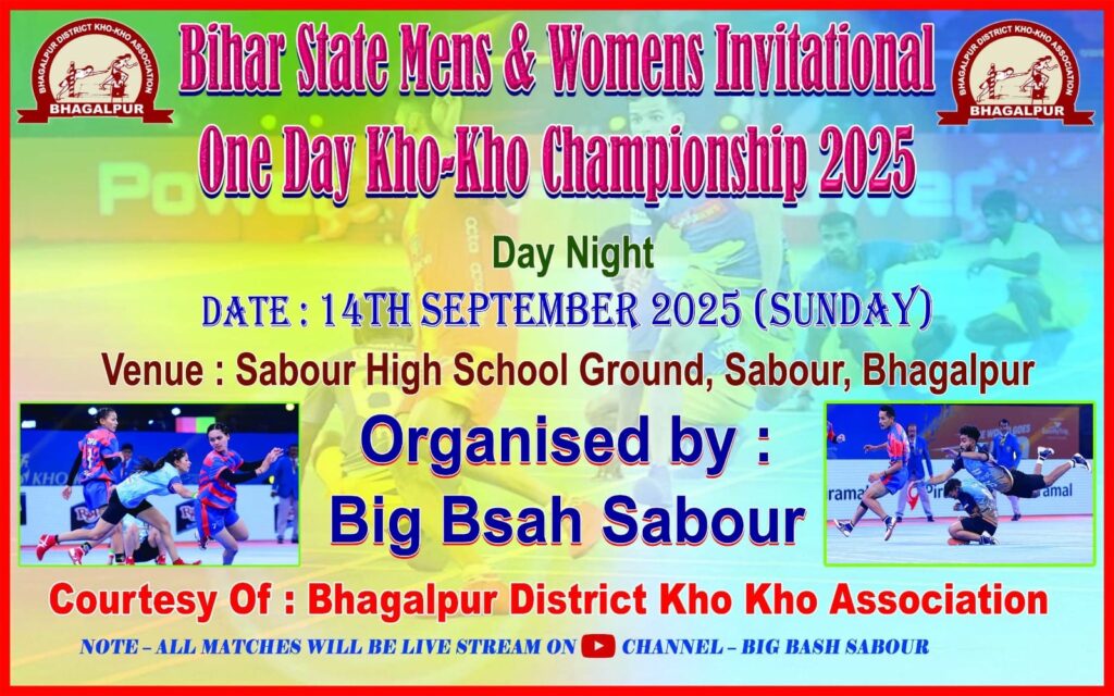 बिहार स्टेट पुरुष एवं महिला आमंत्रित एक दिवसीय खो-खो चैंपियनशिप 2025 का आयोजन 14 सितंबर, रविवार को सबौर हाई स्कूल के मैदान में डे-नाइट फॉर्मेट में किया जाएगा।