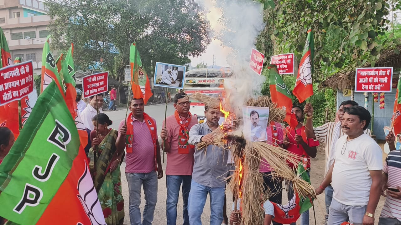 पुतला दहन के दौरान भाजपा कार्यकर्ताओं ने राहुल गांधी और तेजस्वी यादव के खिलाफ जमकर नारेबाजी की।