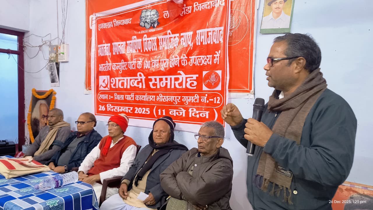 भारतीय कम्युनिस्ट पार्टी (भाकपा) का शताब्दी समारोह शुक्रवार को नागेश्वर भवन, भीखनपुर में धूमधाम और उत्साह के साथ मनाया गया। समारोह की शुरुआत भीखनपुर मोहल्ले तक निकाले गए जुलूस से हुई, जिसमें पार्टी कार्यकर्ताओं और समर्थकों ने बढ़-चढ़कर हिस्सा लिया। जुलूस के बाद पार्टी का झंडोत्तोलन किया गया।