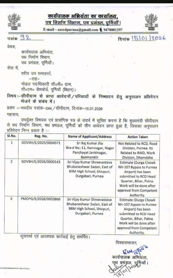दुर्गा चौक (NH-107 बायपास) से पूर्णिया एयरपोर्ट तक की सड़क का एस्टीमेट तैयार कर पथ निर्माण विभाग के मुख्यालय को भेज दिया गया है।