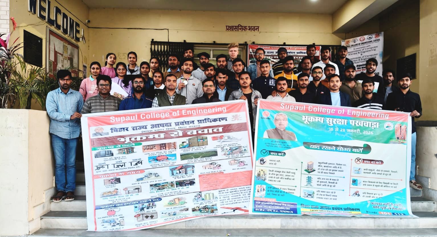 सुपौल कॉलेज ऑफ इंजीनियरिंग में 15 जनवरी से 28 जनवरी तक भूकंप सुरक्षा पखवाड़ा का आयोजन किया जा रहा है। इस आयोजन में सिविल ब्रांच के सभी छात्रों ने भाग लिया और भूकंप से बचने और लोगों को जागरूक करने का प्रण लिया।