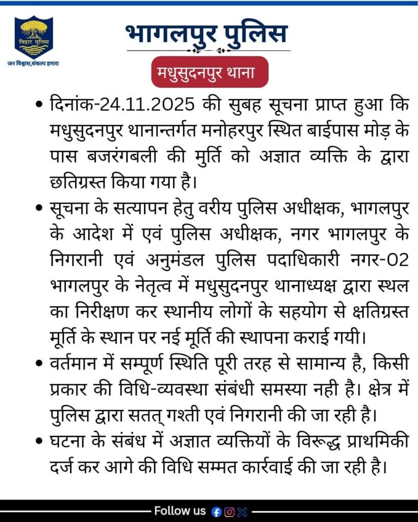 मदुसूदनपुर थाना क्षेत्र के मनोहरपुर स्थित बाइपास मोड़ के पास स्थित बजरंगबली की मूर्ति को अज्ञात व्यक्तियों द्वारा क्षतिग्रस्त किए जाने का मामला सामने आया है। सोमवार, 24 नवंबर 2025 की सुबह इस घटना की सूचना स्थानीय पुलिस को मिली।