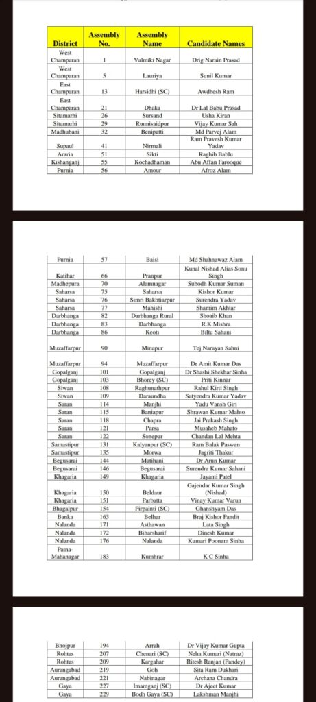 पश्चिम चंपारण के वाल्मीकिनगर सीट से डॉ. एन. प्रसाद, लौरिया से सुनील कुमार, जबकि पूर्वी चंपारण के हरसिधि (SC) से अवधेश राम को टिकट दिया गया है।