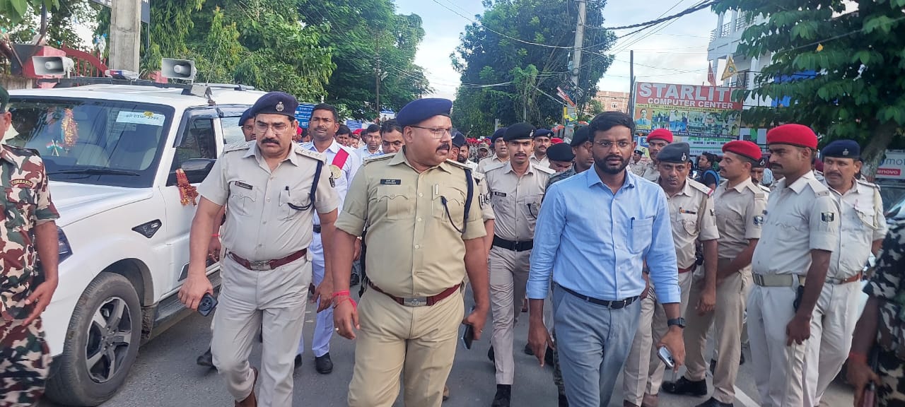 महावीरी झंडा शोभायात्रा जुलूस में विधि व्यवस्था संधारण को लेकर फ्लैग मार्च,डीएम एसपी समेत समस्त अधिकारियों जुलूस रूट में किया फ्लैग मार्च