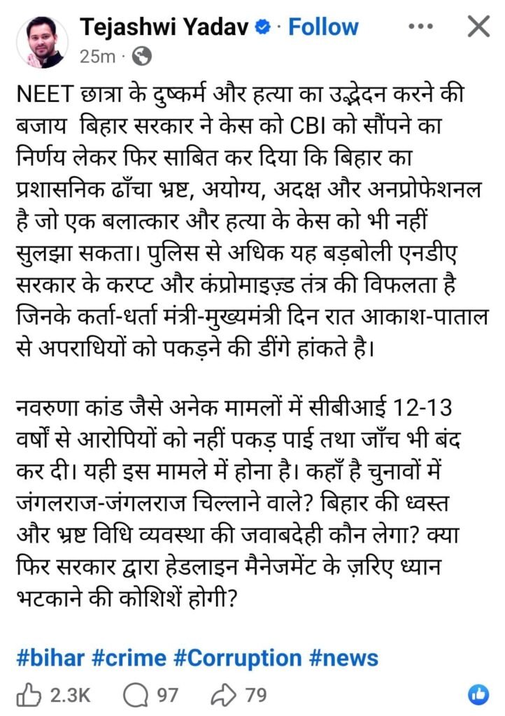 सम्राट की पुलिस का ‘सरेंडर’, तेजस्वी का ‘जंगलराज’ पर वार: क्या CBI दिला पाएगी NEET छात्रा को न्याय?