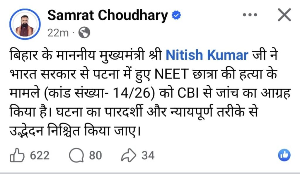 ​बिहार के उपमुख्यमंत्री सम्राट चौधरी ने सोशल मीडिया पर इसकी पुष्टि करते हुए बताया कि मुख्यमंत्री ने भारत सरकार से इस मामले (कांड संख्या- 14/26) की सीबीआई जांच का आग्रह किया है। सम्राट चौधरी, जो गृह मंत्री बनते ही अपराधियों को ‘जहन्नुम’ भेजने का दावा कर रहे थे, उनके लिए यह केस एक बड़ी चुनौती बन गया है। उन्होंने कहा कि सरकार घटना का पारदर्शी और न्यायपूर्ण उद्भेदन चाहती है।