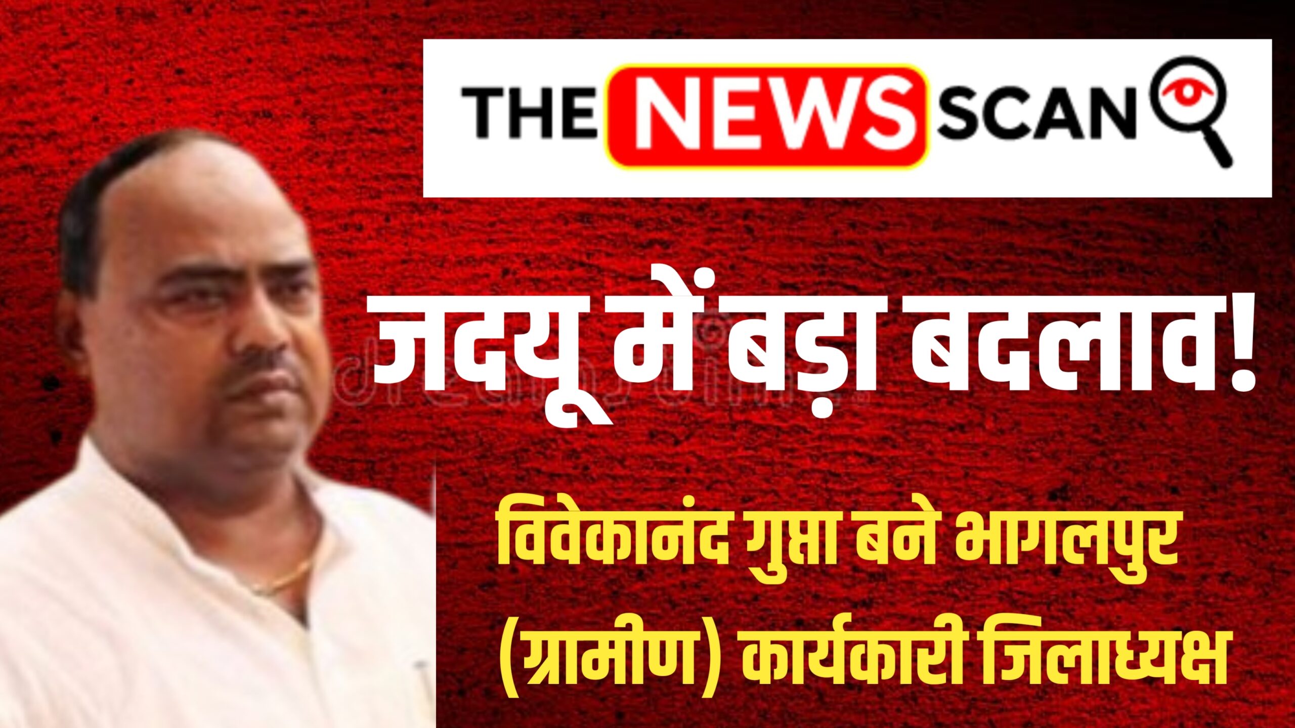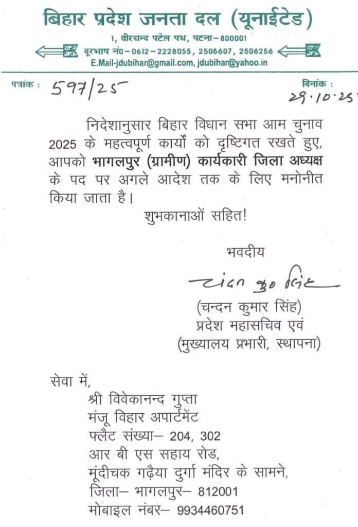 बिहार विधानसभा चुनाव 2025 को ध्यान में रखते हुए जदयू ने भागलपुर जिले में अहम संगठनात्मक बदलाव किया है। पार्टी के प्रदेश महासचिव सह मुख्यालय प्रभारी चंदन कुमार सिंह द्वारा जारी पत्र के अनुसार विवेकानंद गुप्ता को भागलपुर (ग्रामीण) कार्यकारी जिलाध्यक्ष के पद पर मनोनीत किया गया है।