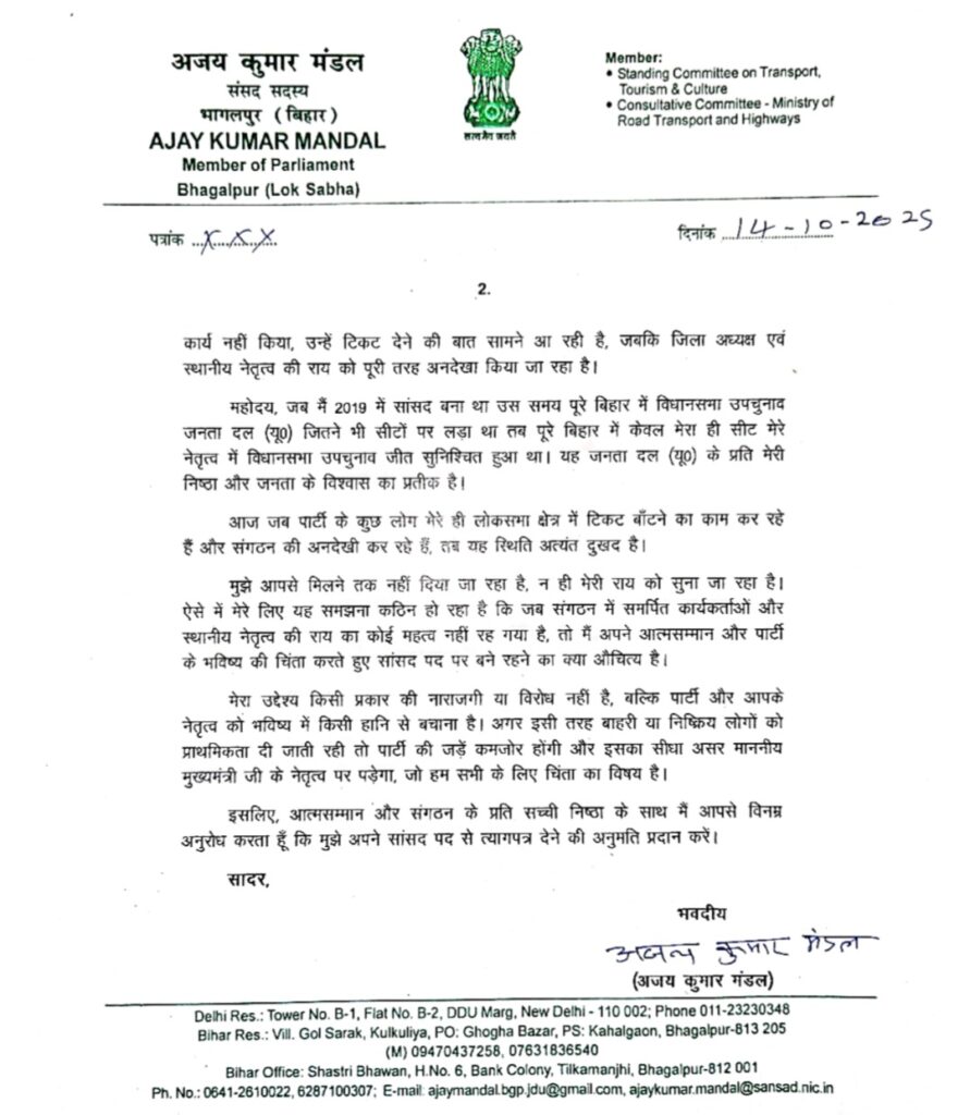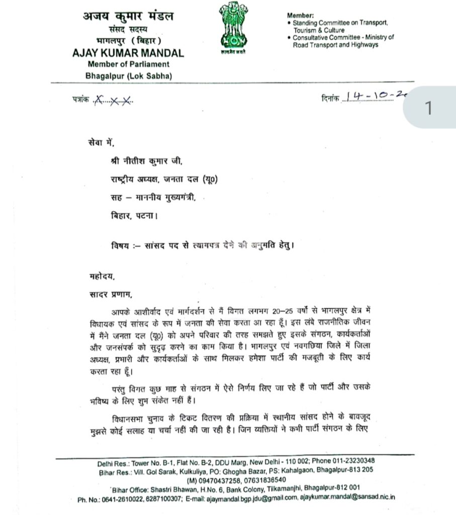 बिहार की राजनीति एक बार फिर करवट लेती दिखाई दे रही है। जनता दल (यूनाइटेड) के वरिष्ठ नेता और भागलपुर से लोकसभा सांसद अजय कुमार मंडल ने मुख्यमंत्री नीतीश कुमार को संबोधित एक तीखे, लेकिन विनम्र लहजे में लिखे गए पत्र के माध्यम से सांसद पद से इस्तीफे की अनुमति मांगी है। इस पत्र ने सियासी गलियारों में हलचल पैदा कर दी है।