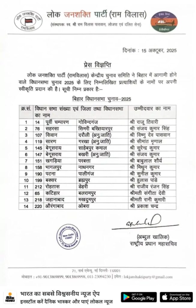 लोक जनशक्ति पार्टी (रामविलास) ने बिहार विधानसभा चुनाव 2025 के लिए अपने उम्मीदवारों की पहली सूची जारी कर दी है। पार्टी की केंद्रीय चुनाव समिति ने जिन नामों पर अपनी मुहर लगाई है, उनमें कुल 14 प्रत्याशी शामिल हैं।