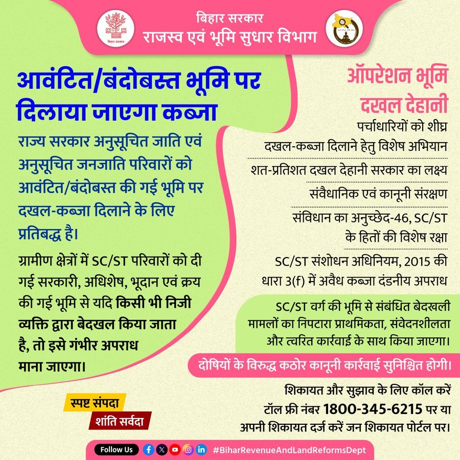 बिहार में जमीन के पर्चाधारियों, खासकर अनुसूचित जाति (SC) और अनुसूचित जनजाति (ST) के परिवारों के लिए बड़ी राहत की खबर है। अगर सरकारी कागज (पर्चा) मिलने के बावजूद दबंगों ने आपकी जमीन पर कब्जा कर रखा है, तो अब प्रशासन खुद आपको उस पर काबिज कराएगा। बिहार सरकार ने भूमिहीनों को उनका हक दिलाने के लिए राज्यव्यापी ‘ऑपरेशन दखल दिहानी’ (Operation Dakhal Dehani) का आगाज कर दिया है। सरकार ने साफ कर दिया है कि आवंटित जमीन से किसी को बेदखल करना अब गंभीर अपराध की श्रेणी में माना जाएगा।