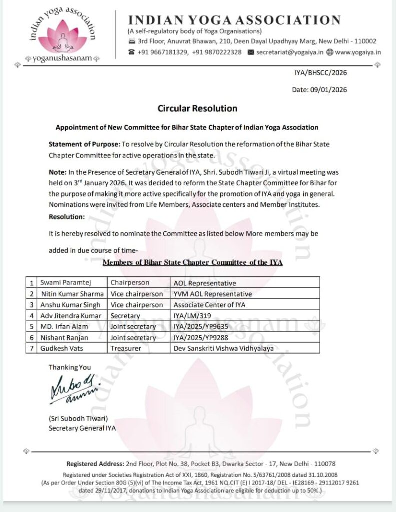 IYA द्वारा जारी सर्कुलर के अनुसार, संस्था के महासचिव सुबोध तिवारी की उपस्थिति में बीती 3 जनवरी 2026 को एक उच्चस्तरीय वर्चुअल बैठक आयोजित की गई थी। इस बैठक में बिहार राज्य चैप्टर को अधिक सक्रिय बनाने और राज्य के कोने-कोने तक योग के लाभ पहुँचाने के लिए समिति के पुनर्गठन का निर्णय लिया गया।