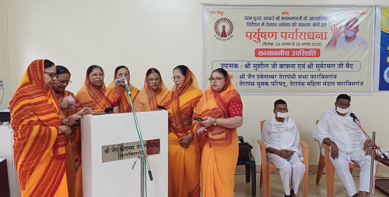 फारबिसगंज तेरापंथ भवन में कोलकाता से आए हुए उपासक सुशील बाफना और सुमेरमल बैद की उपस्थिति में शुक्रवार को पर्युषण महापर्व का तीसरा दिन सामायिक दिवस के रूप में मनाया गया।